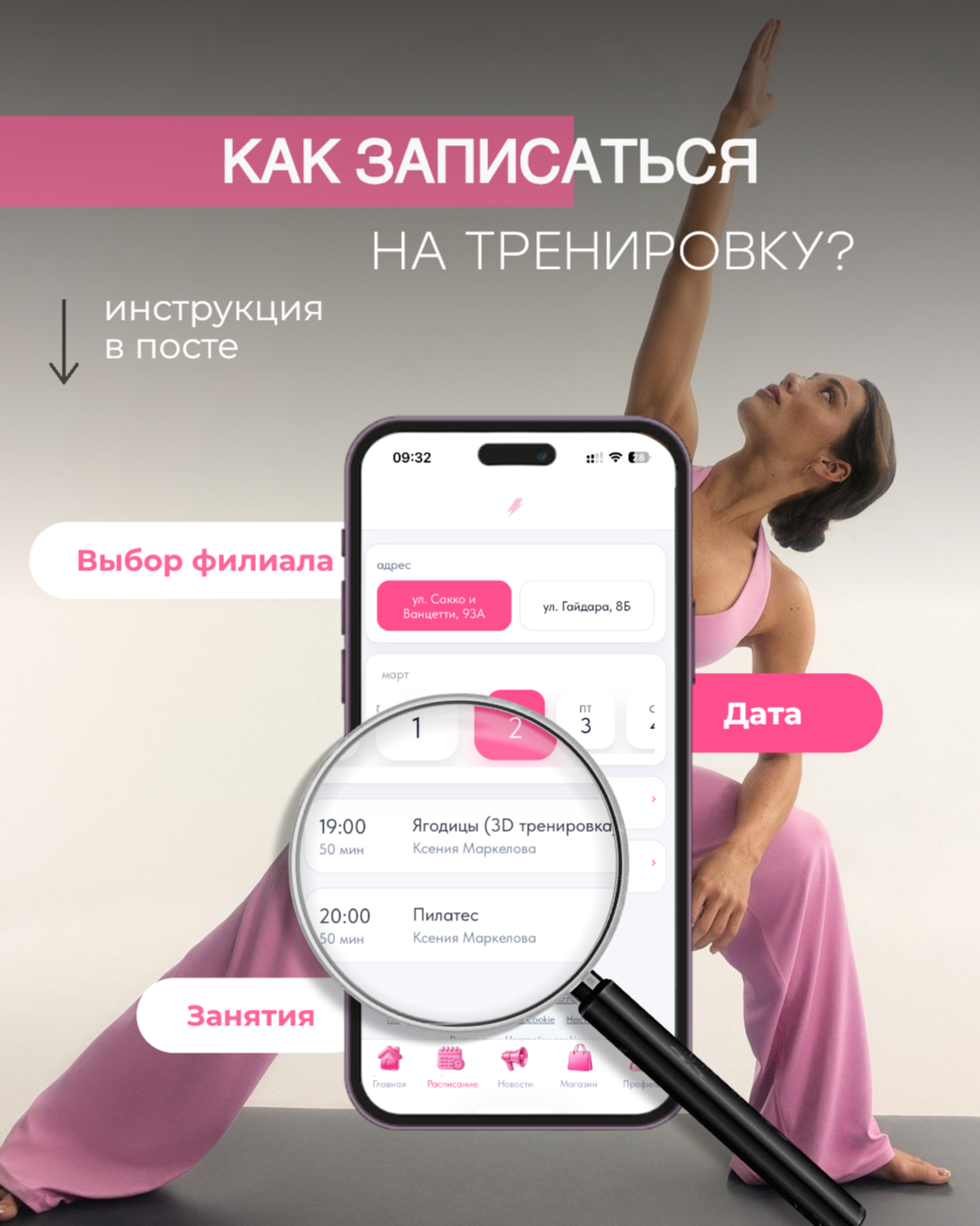 1. Откройте «Расписание» 2. Выберите филиал, день и занятие 3. Оплатите пробное или абонемент (с…